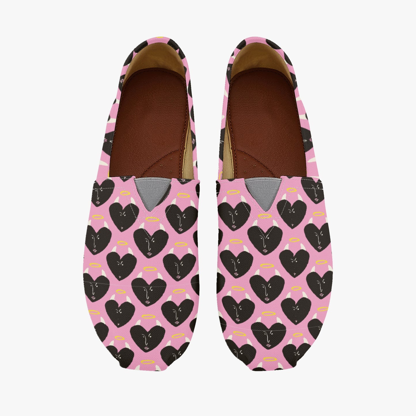 Flirt with trouble in our Mischief Slip-Ons, where sugar meets spice on every step. Set against a playful pink canvas, these flats feature jet-black hearts with devilish grins—and just to keep things interesting—tiny white halos floating overhead. They’re comfy, cheeky, and made to stir up some fun wherever you go. Perfect for the rebels with a soft side.